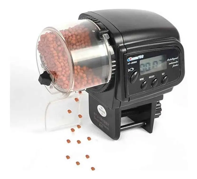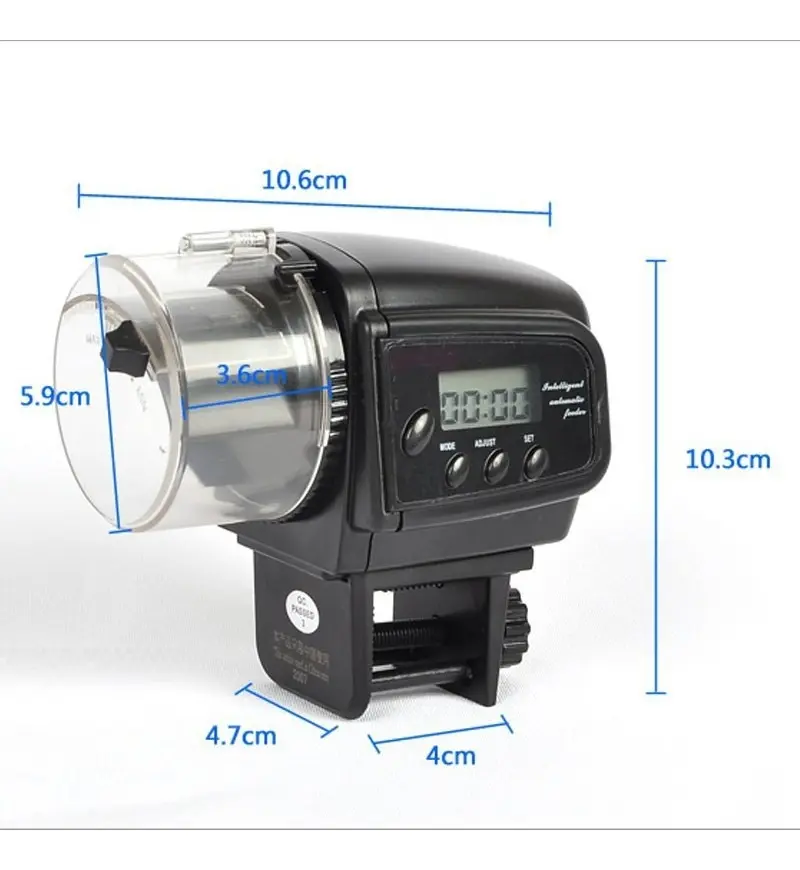 CARACTERÍSTICAS DEL ALIMENTADOR – Programable hasta 4 comidas diarias con ajuste de dosificación – Puede llenar el contenedor con comida sin desmontar el alimentador automático. – Volúmenes de alimentos programables y tiempos de alimentación. – Al ajustar el control deslizante, puede aumentar o disminuir la cantidad de alimentos que se dispensa por rotación. – Trabaja con copos o pellets secos. – Hasta cuatro veces en un día. – El aviso «Lo» que se muestra en la pantalla LCD indica que el poder es bajo. – Tiene un reloj digital para la precisión. – Puede funcionar automáticamente y manualmente. – Una clara pantalla LCD fácil de leer que muestra toda la información de un vistazo. – El alimentador se puede montar de dos maneras (de pie libre o montado en la rueda) según la forma de tu acuario. – Seguro y conveniente. – Operación e instalación simples. – Puede configurar hasta 4 tiempos de alimentación – Tipo de batería: 2 pilas AAA (No incluido) – Dimensiones de la pantalla LCD (aprox.): 2.5*1.2 cm/0.98 «* 0.47» – Dimensiones generales: 10 x 10,5 x 4 cm